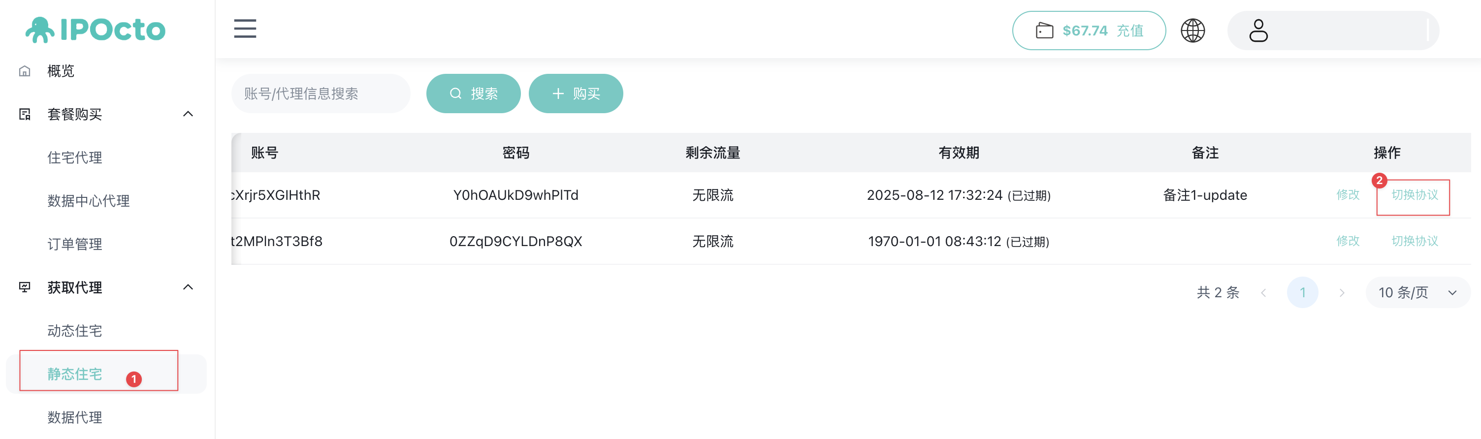 获取代理-静态住宅-在列表页右滑,点击切换协议